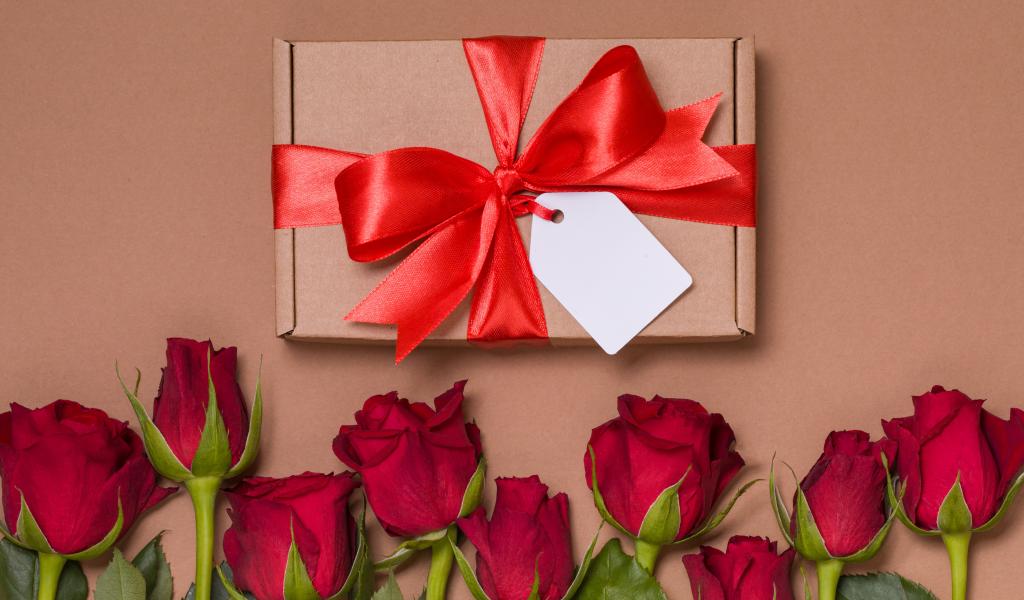 Wallpaper A gift with a red bow on a beige background with red roses