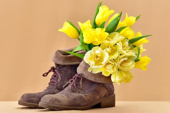 Wallpaper Bouquet of yellow tulips in old shoes