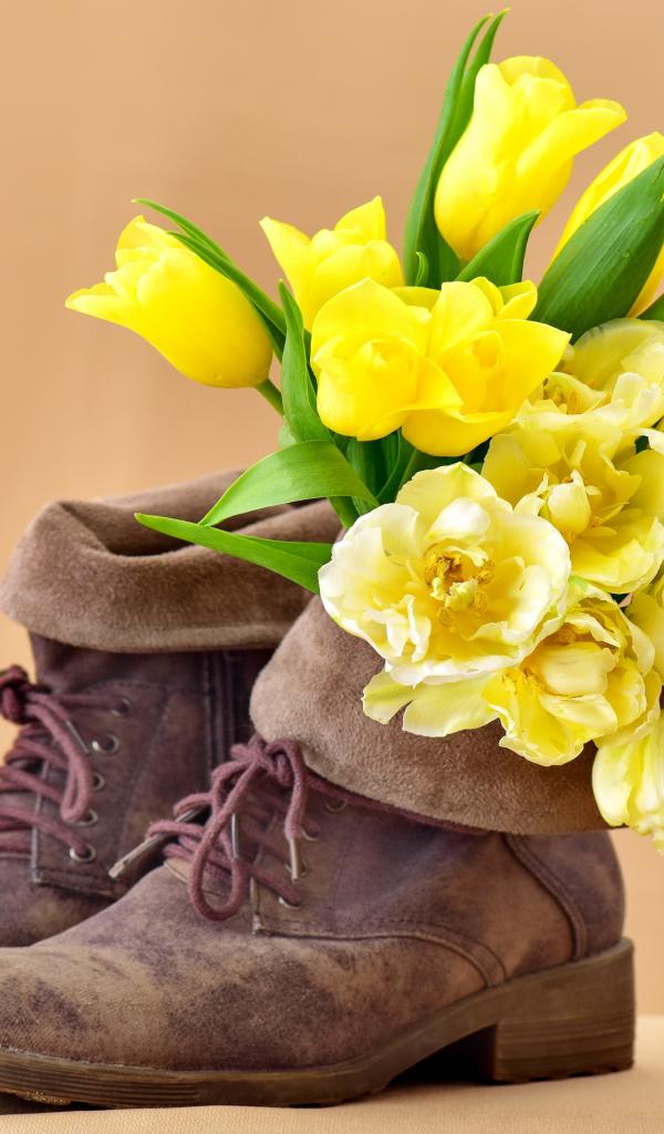 Wallpaper Bouquet of yellow tulips in old shoes