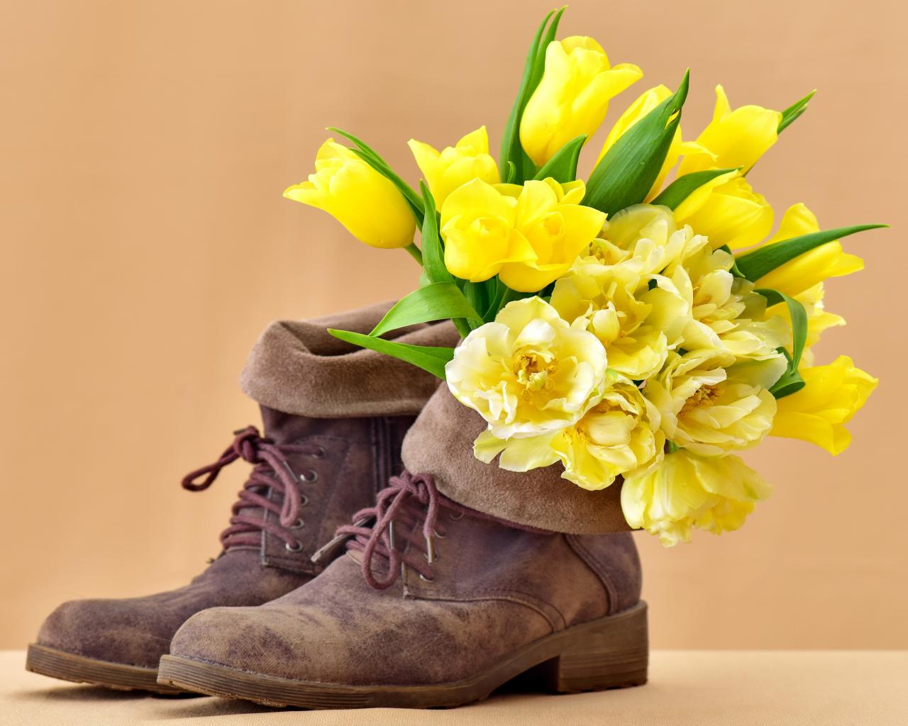 Wallpaper Bouquet of yellow tulips in old shoes
