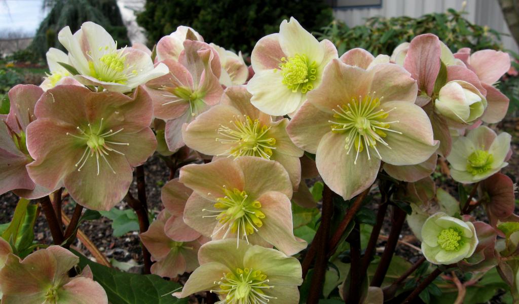 Wallpaper Many pink flowers of hellebore closeup