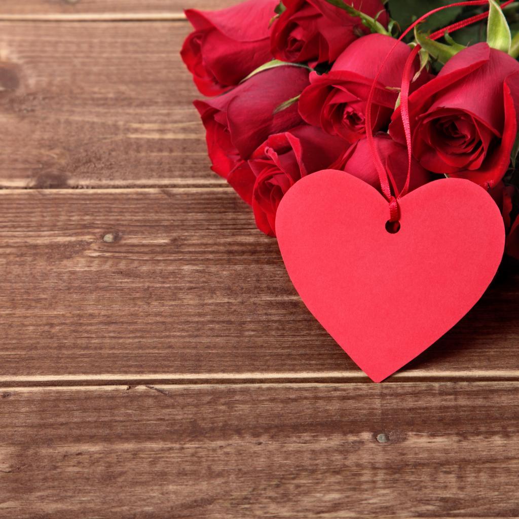 Wallpaper A bouquet of red roses on a wooden table with a red heart