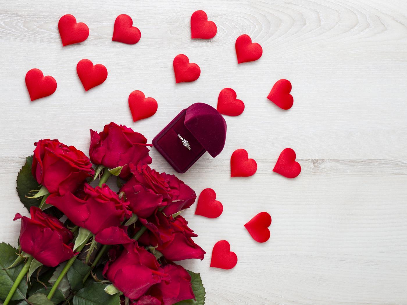 Wallpaper A bouquet of red roses with red hearts and a box with a ring