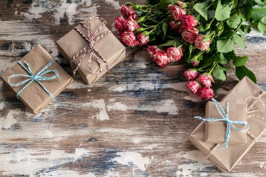 Wallpaper Gift boxes on a wooden surface with a bouquet of roses