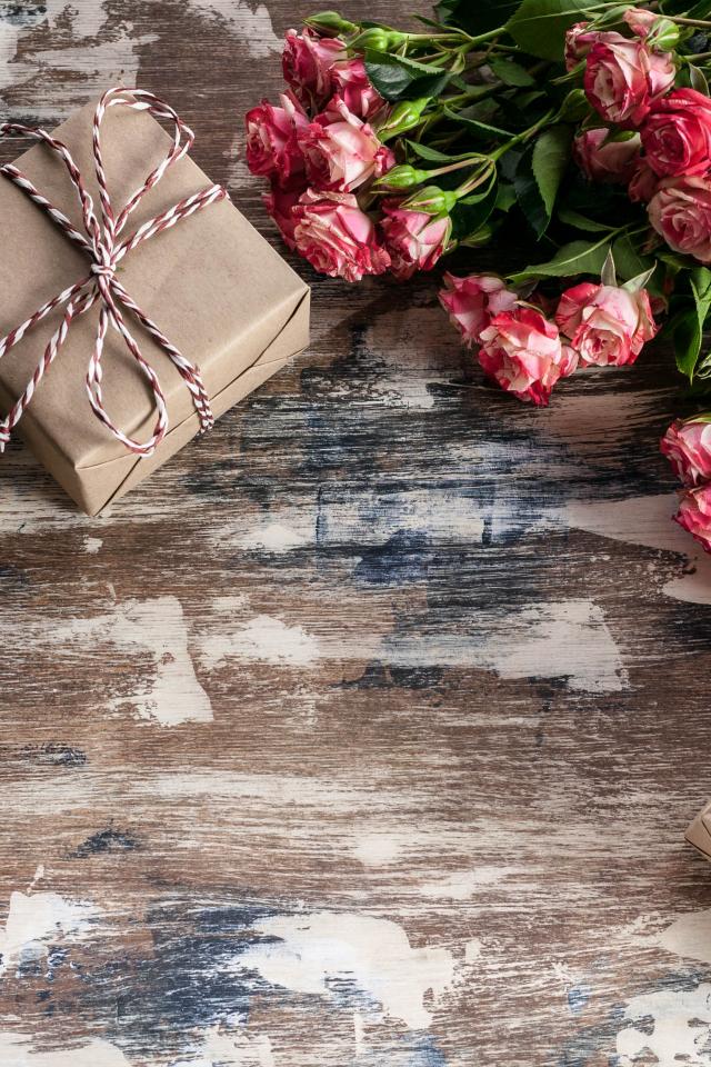 Wallpaper Gift boxes on a wooden surface with a bouquet of roses