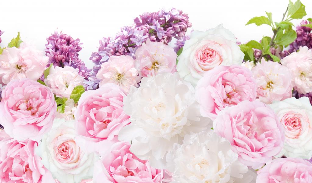 Wallpaper Bouquet of peonies with lilac on a white background