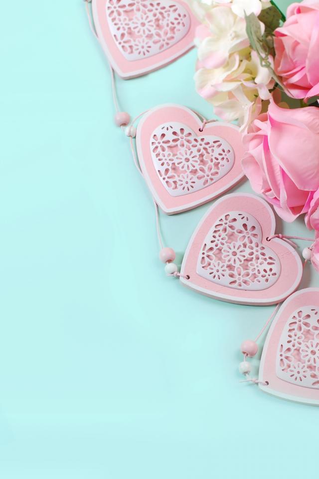 Wallpaper A bouquet of pink roses on a blue background with hearts