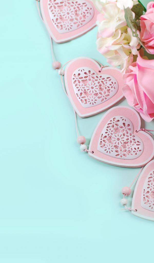 Wallpaper A bouquet of pink roses on a blue background with hearts