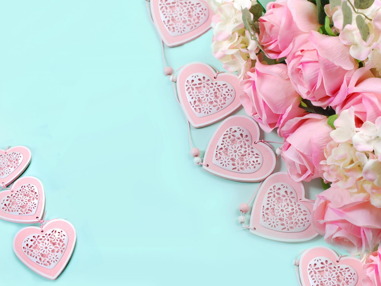 Wallpaper A bouquet of pink roses on a blue background with hearts
