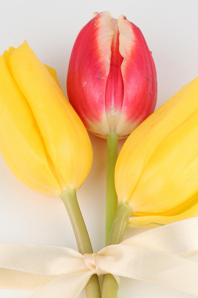 » Wallpaper Three tulips with a bow on a gray background