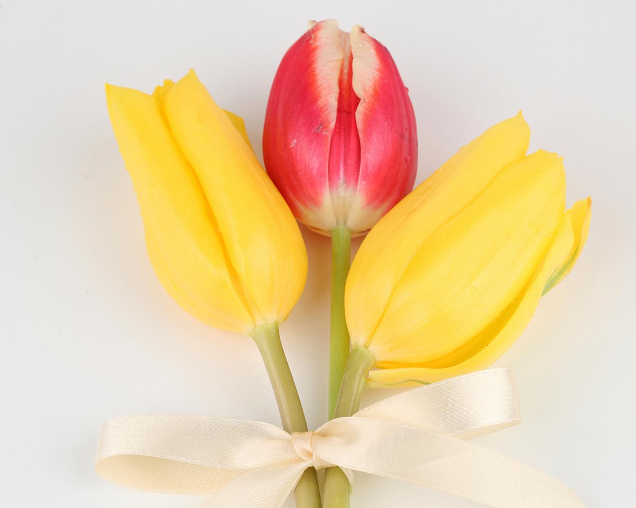 Wallpaper Bouquet of red tulips with ribbon on a gray background
