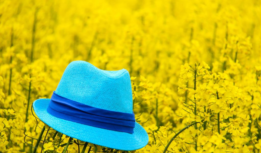 » Wallpaper Blue hat lies on yellow flowers.