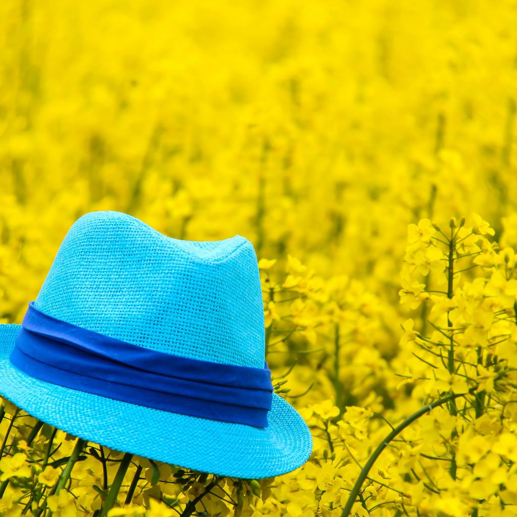 » Wallpaper Blue hat lies on yellow flowers.