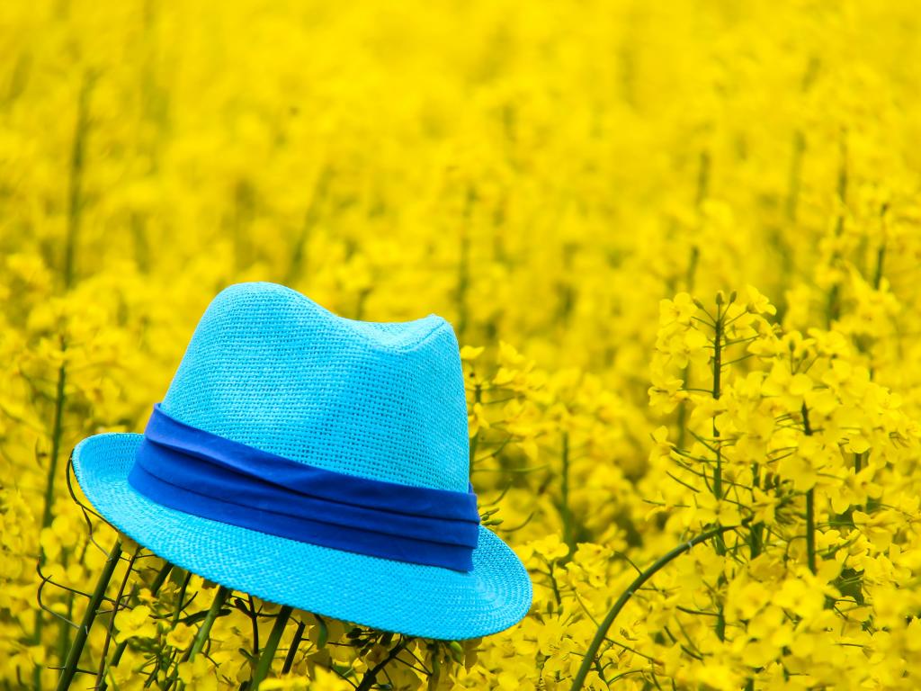 » Wallpaper Blue hat lies on yellow flowers.