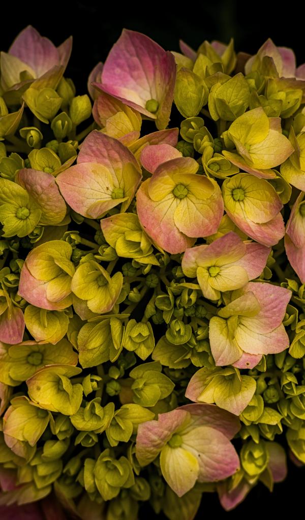 Wallpaper Pink hydrangea flower blooming on a black background