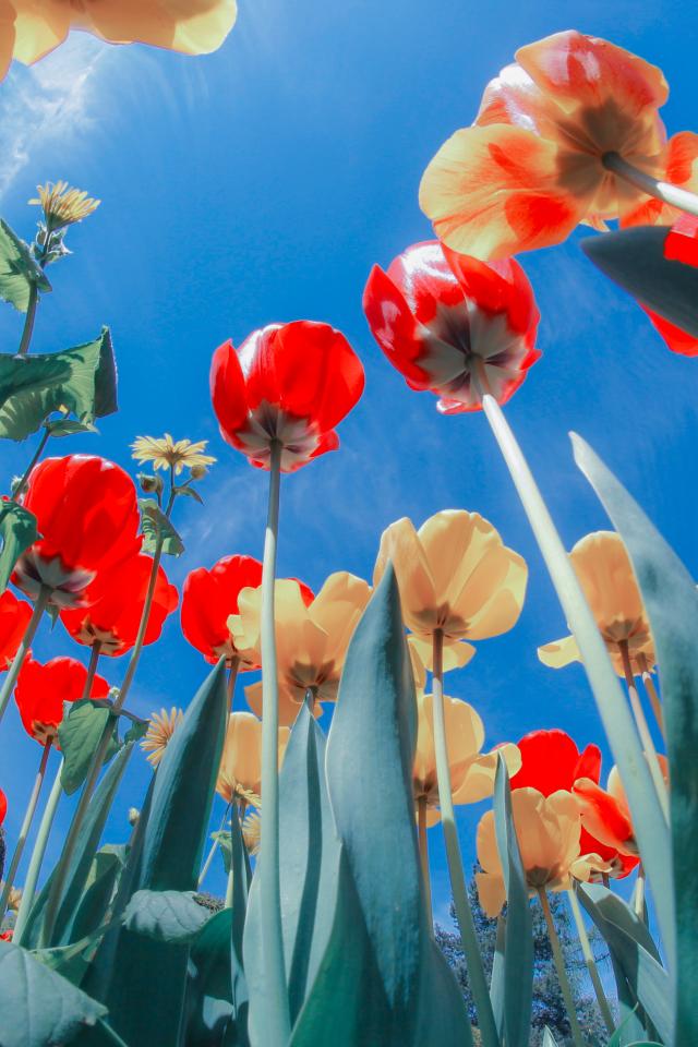 Wallpaper Yellow and red tulips on a bed under the blue sky