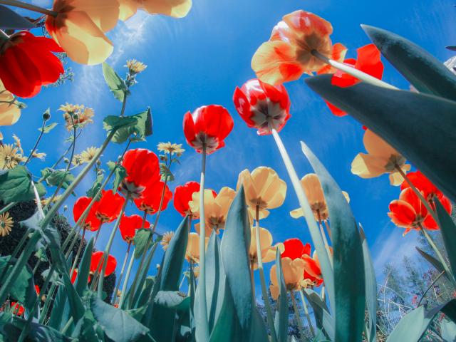 Wallpaper Yellow and red tulips on a bed under the blue sky
