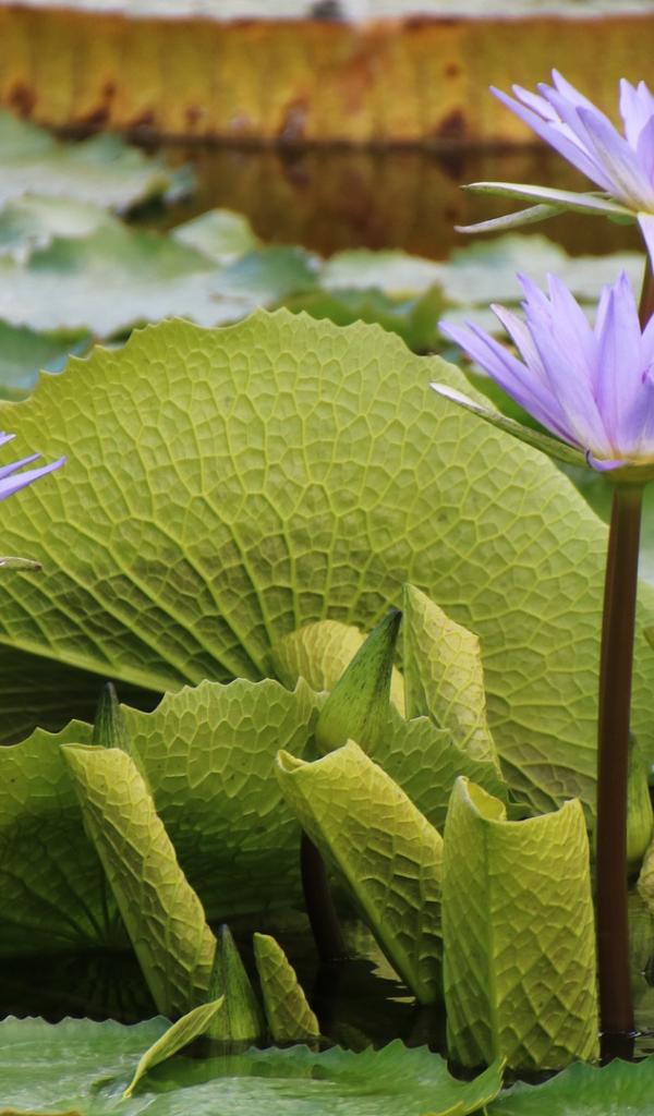Wallpaper Lilac lotus flowers in water with large green leaves