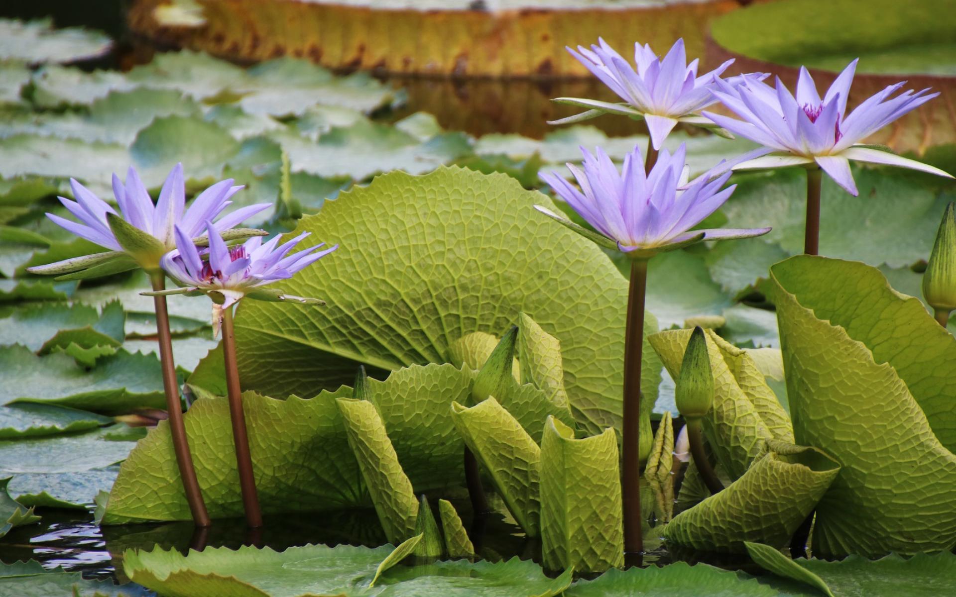Wallpaper Lilac lotus flowers in water with large green leaves