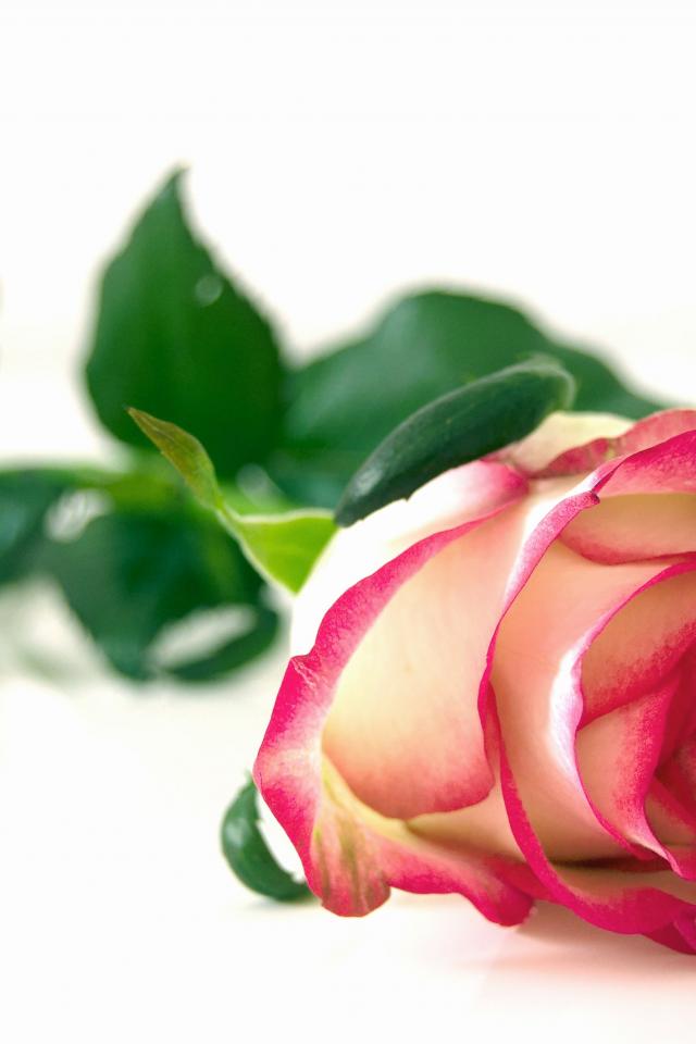 Wallpaper Beautiful pink rose with green leaves on a white background
