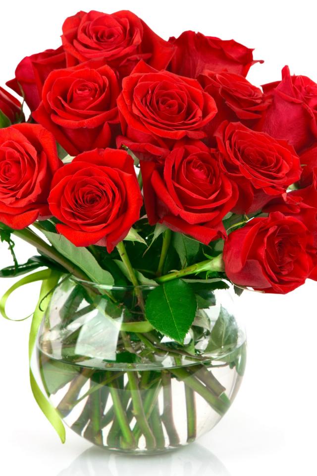 Wallpaper Bouquet of red roses in a glass vase on a white background