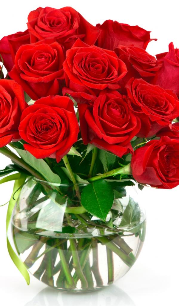 Wallpaper Bouquet of red roses in a glass vase on a white background