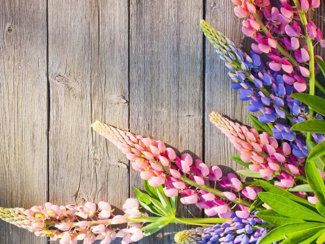 Wallpaper Pink and blue lupins on a wooden background