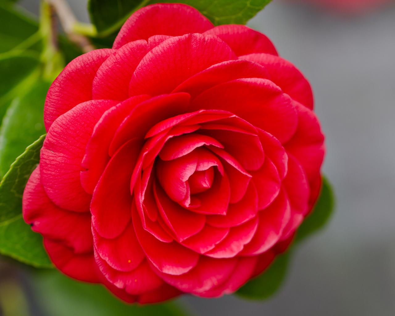 Wallpaper Beautiful delicate red camellia flower on a gray background