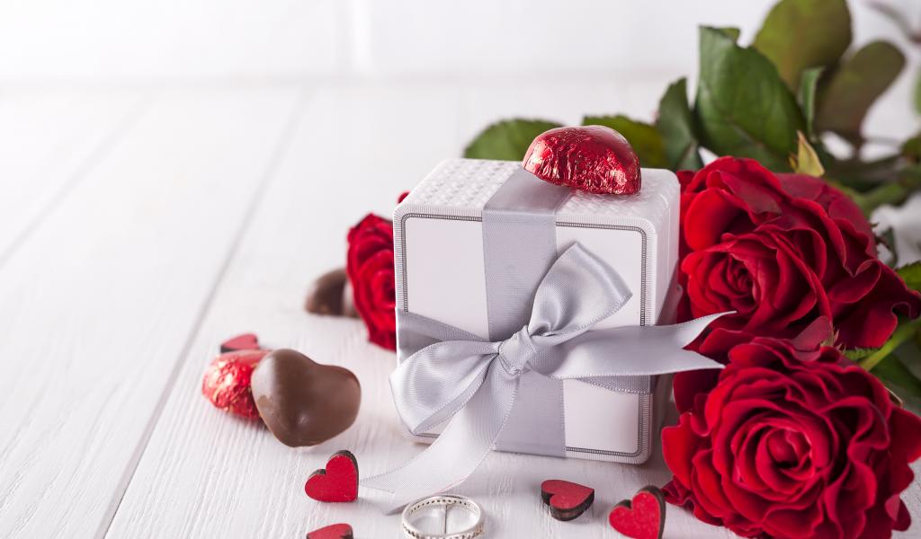 Wallpaper A gift on the table with sweets and a bouquet of red roses