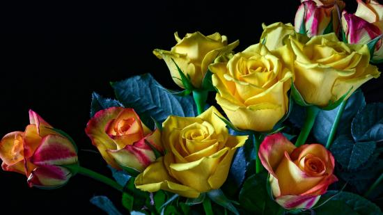 Wallpaper A bouquet of yellow - pink roses on a black background