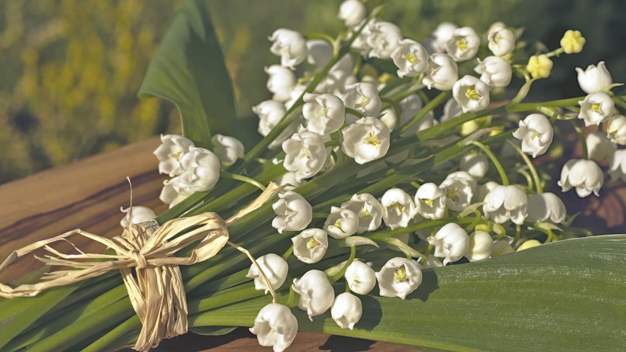 Wallpaper Beautiful white lilies of the valley with green leaves