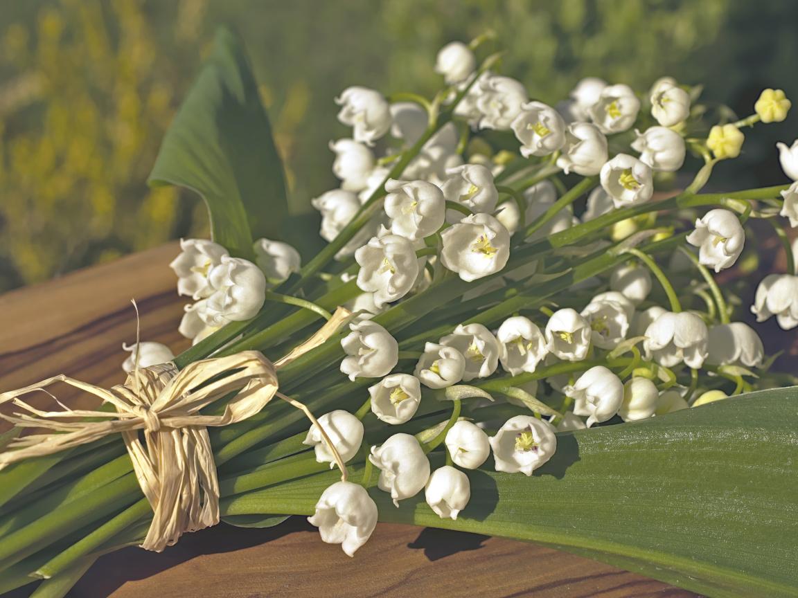 Wallpaper Beautiful white lilies of the valley with green leaves