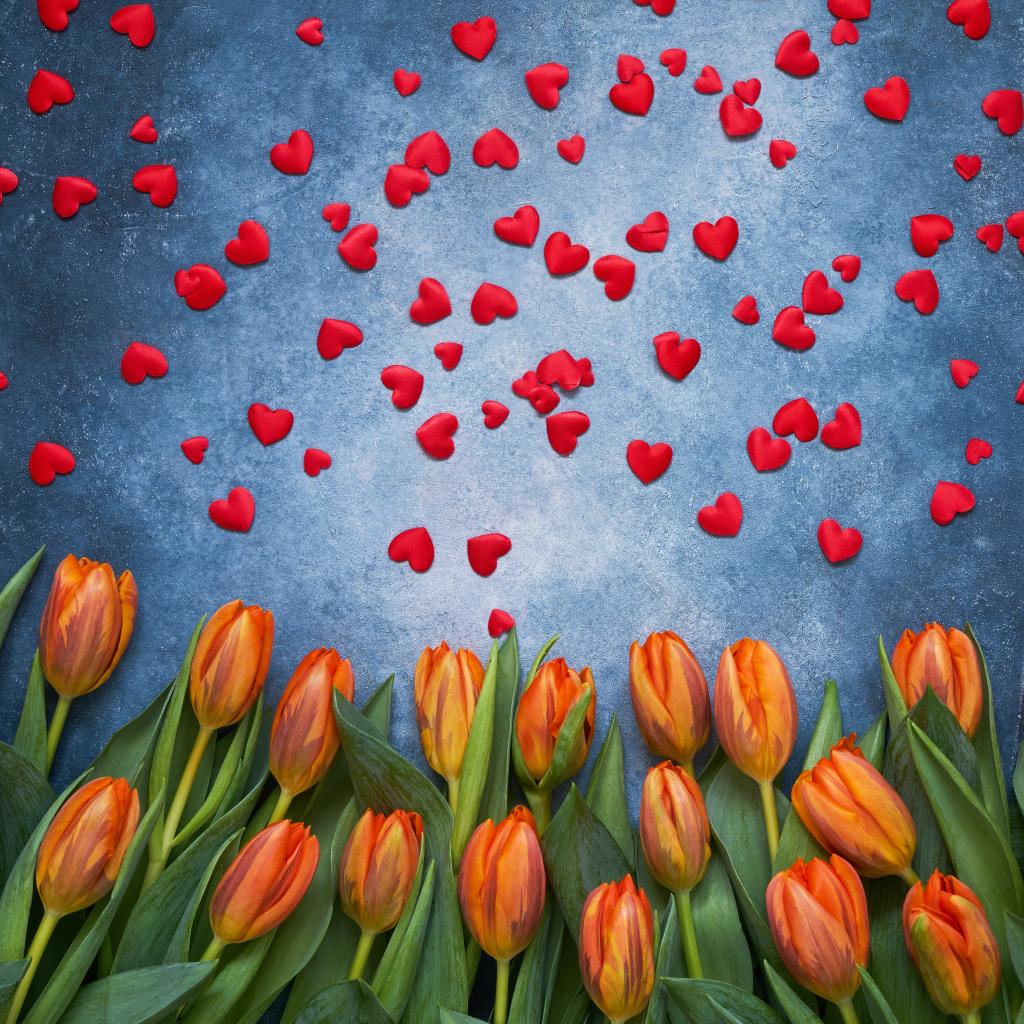 Wallpaper Orange tulips on a gray background with red hearts