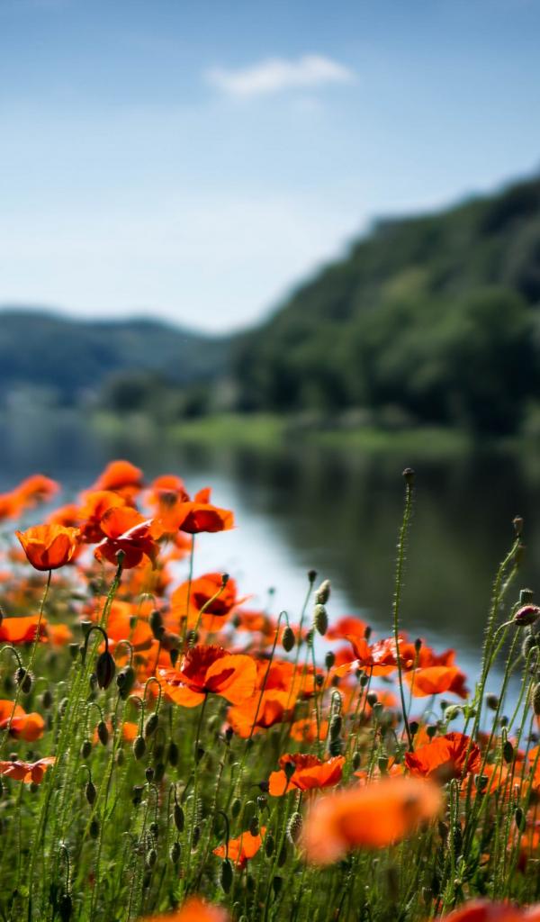 » Wallpaper Red poppies in the sun by the river