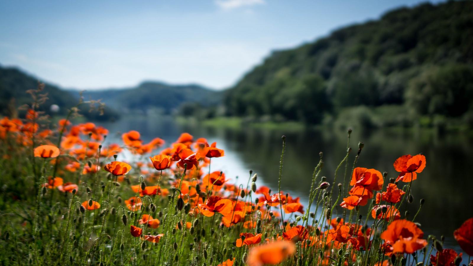» Wallpaper Red poppies in the sun by the river