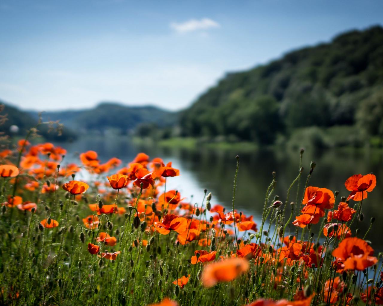 » Wallpaper Red poppies in the sun by the river
