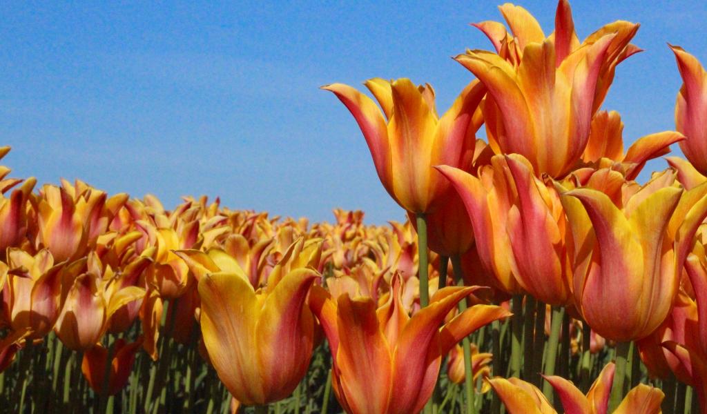 Wallpaper A lot of orange tulips against the blue sky