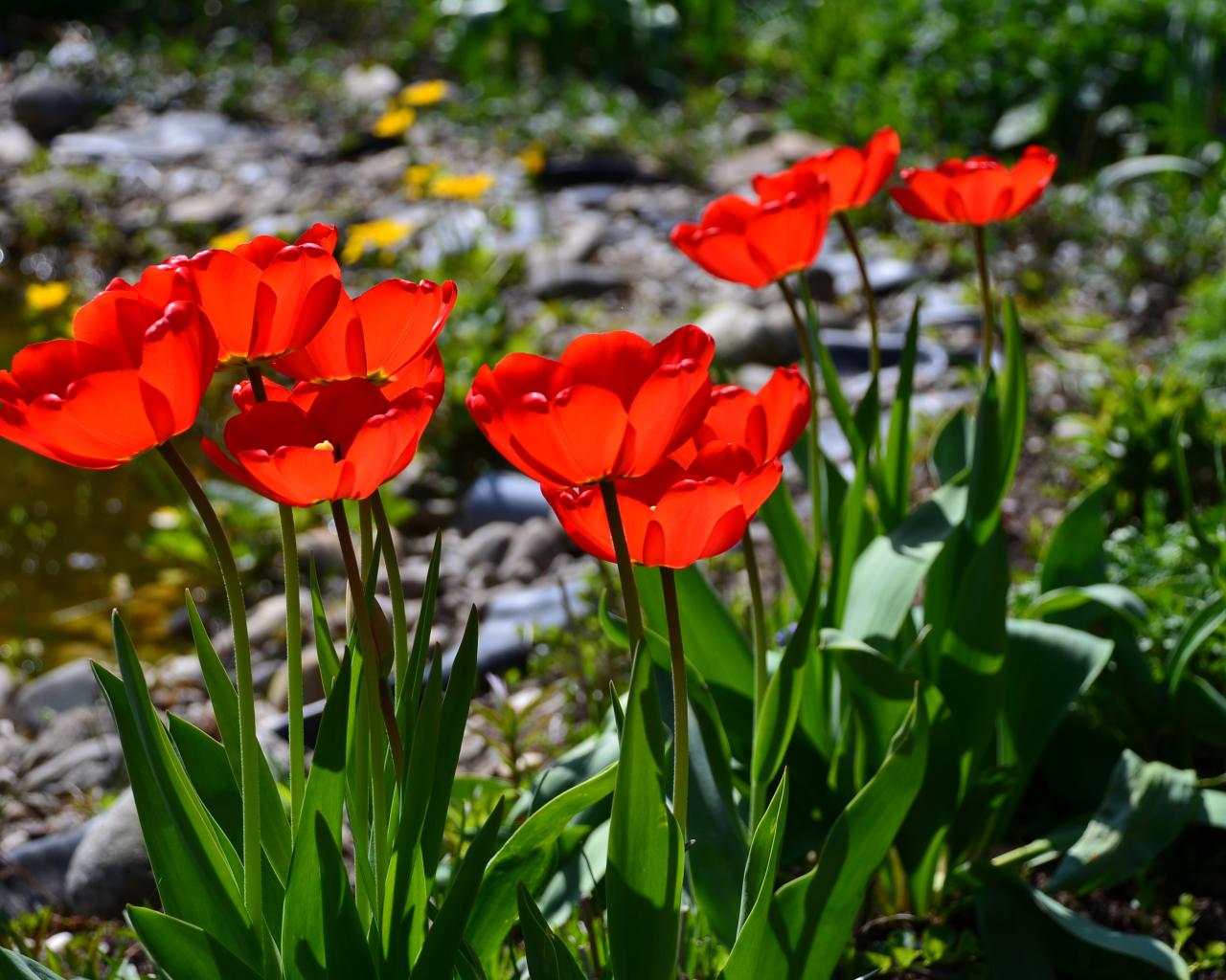 Wallpaper Beautiful scarlet tulips in the sun on a flower bed