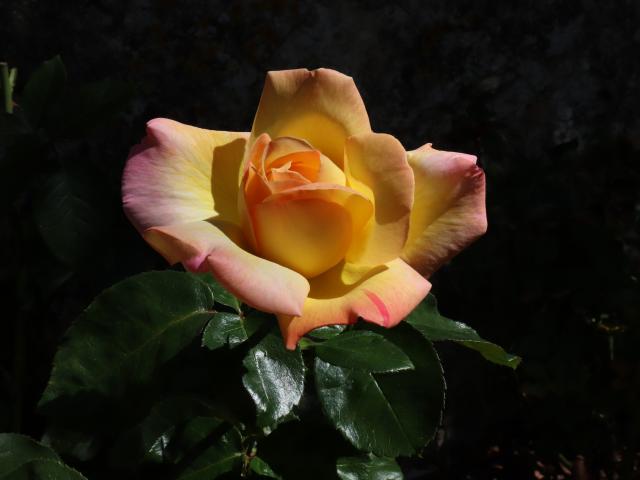 Wallpaper Beautiful rose with green leaves in the flowerbed close-up
