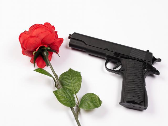 Wallpaper Red rose and black gun on a white background