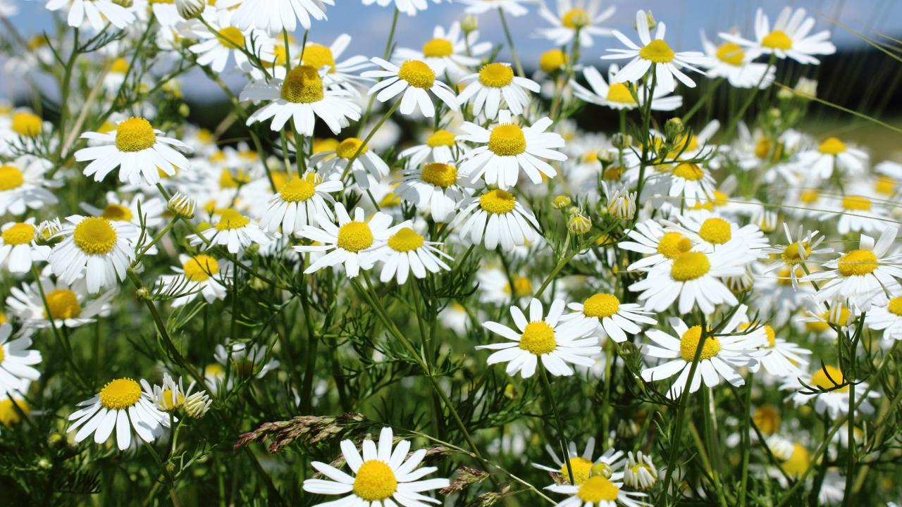 Wallpaper Daisies, White daisies, Blue sky, Wildflowers