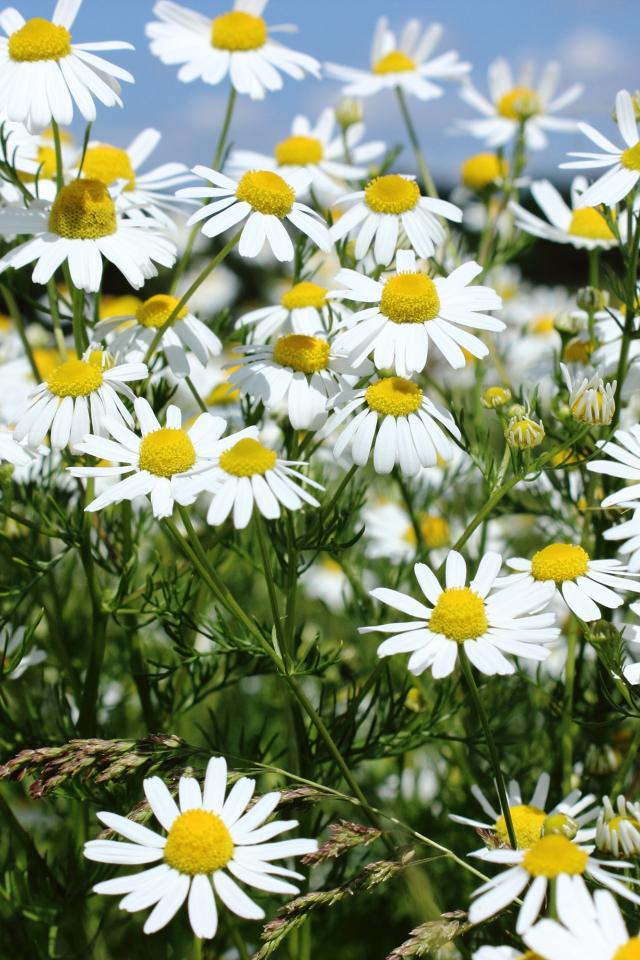 Wallpaper Daisies, White daisies, Blue sky, Wildflowers