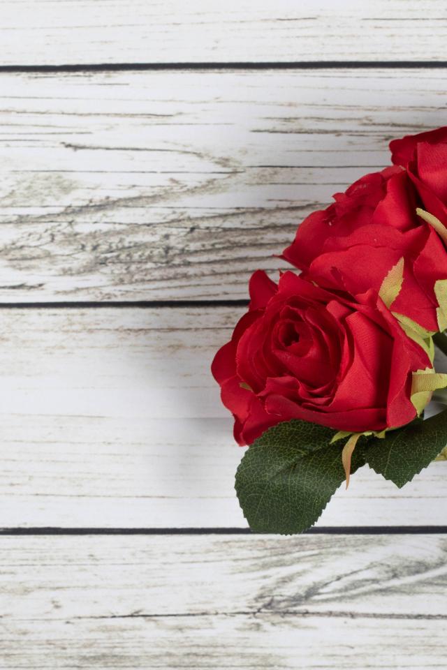 Wallpaper Three artificial red roses on a wooden background
