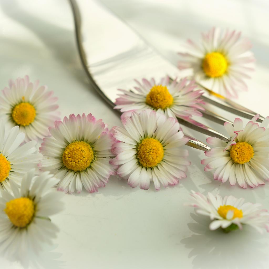 Wallpaper White daisies with yellow centers on a table with a fork