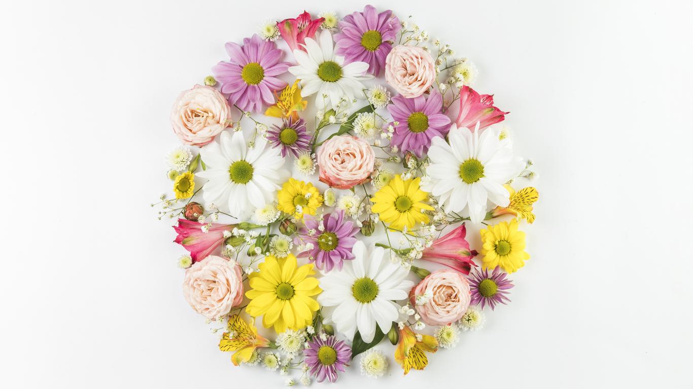 Wallpaper Bouquet of pink and white roses and alstromeria flowers on a white background
