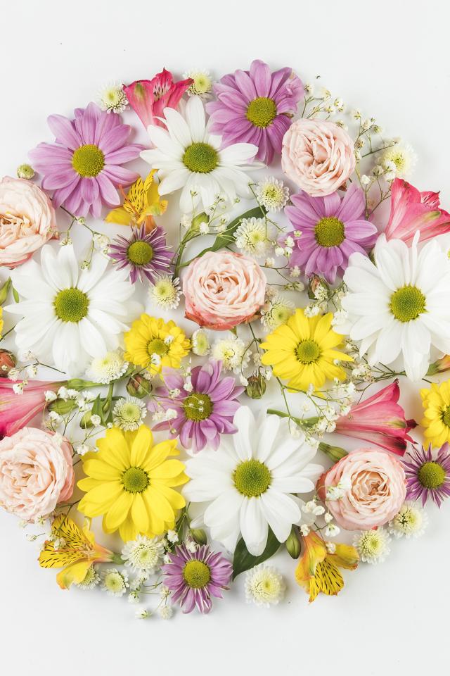 Wallpaper White wicker basket with flowers on a white background