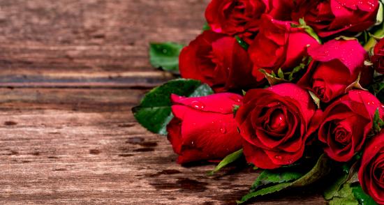Wallpaper Bouquet of red roses on a wooden table in drops of water
