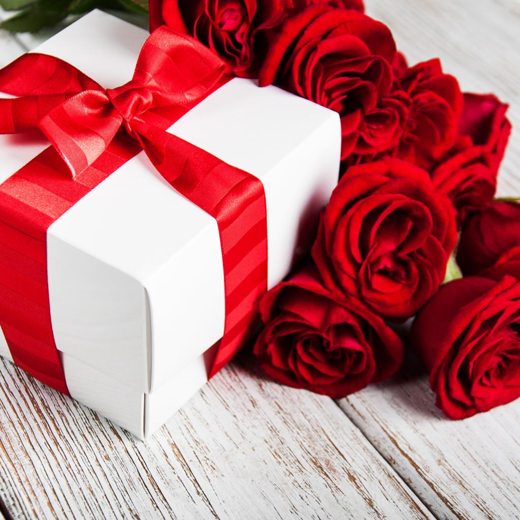 Wallpaper Red roses on a table with a gift with a red ribbon