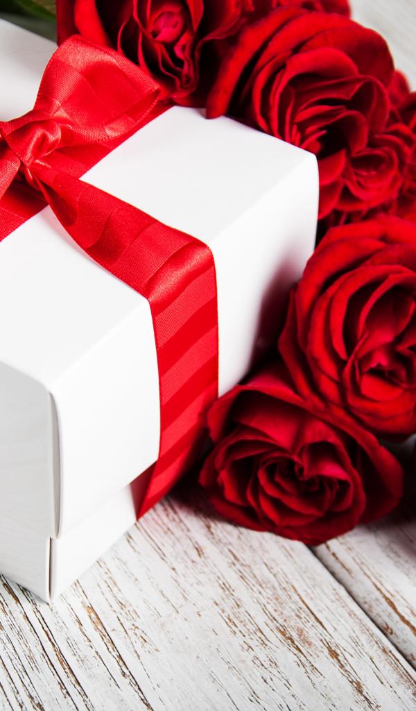 Wallpaper Red roses on a table with a gift with a red ribbon
