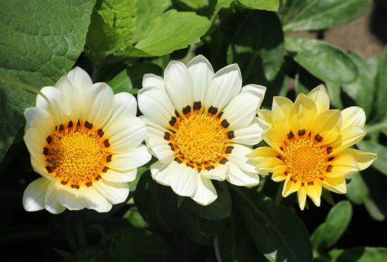 Wallpaper Three gazania flowers in green leaves on a flower bed